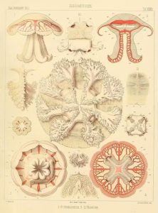 Image credits: Ernst Haeckel, “Discomedusae: 1-8 Cannorhiza, 9-12 Versura,” 1879. Public Domain Image Archive.